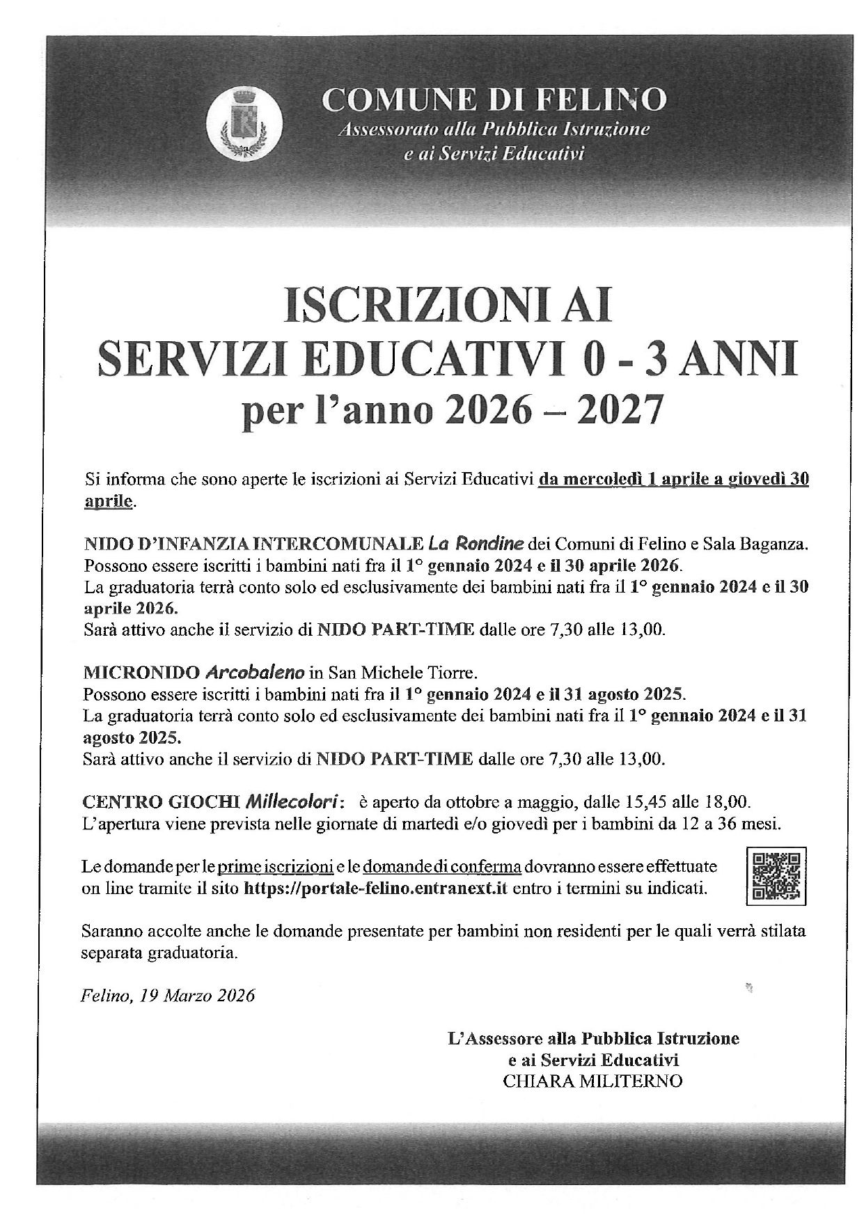 Le domande di iscrizione sono riservate alle bambine e ai bambini nate/i dal 01/01/2024 al 30/04/2026 per il nido d'infanzia intercomunale La Rondine dei Comuni di Felino e Sala Baganza, mentre sono riservate per i nati tra il 1° gennaio 2024 e il 31 agosto 2025 per il micronido Arcobaleno in San Michele Tiorre