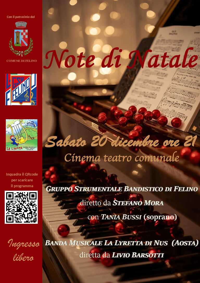 “Note di Natale”, il tradizionale concerto del Gruppo Strumentale Bandistico di Felino diretto da Stefano Mora, vedrà quest’anno l’esibizione del soprano Tania Bussi e la partecipazione della Banda Musicale “La Lyretta” di Nus (Aosta) diretta da Livio Barsotti.