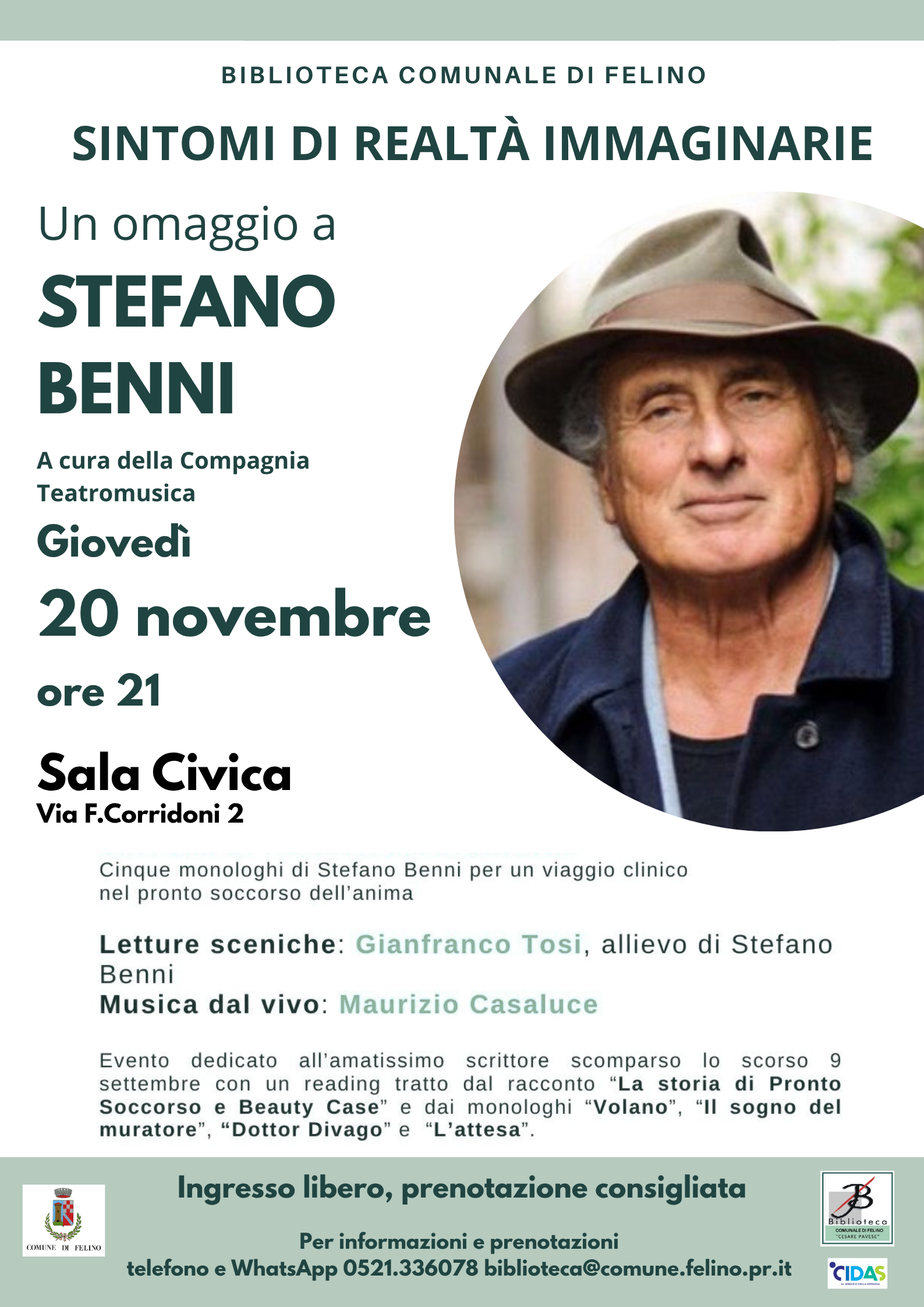 "Sintomi di realtà immaginarie": un omaggio a Stefano Benni, scomparso il 9 settembre scorso, promosso dall’assessorato alla Cultura del Comune di Felino e dalla Biblioteca Comunale “Cesare Pavese”. Il reading musicale della compagnia Teatromusica è un viaggio emozionante attraverso cinque brani dei uno degli autori più amati del nostro tempo, tratti dal racconto “La storia di Pronto Soccorso e Beauty Case” e dai monologhi “Volano”, “Il sogno del muratore”, “Dottor Divago” e “L’attesa”.